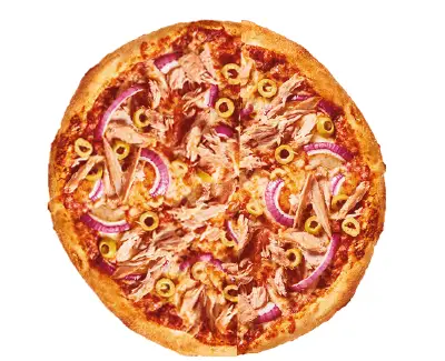 Tomatensaus, mozzarella, tonijn, uitjes en olijven